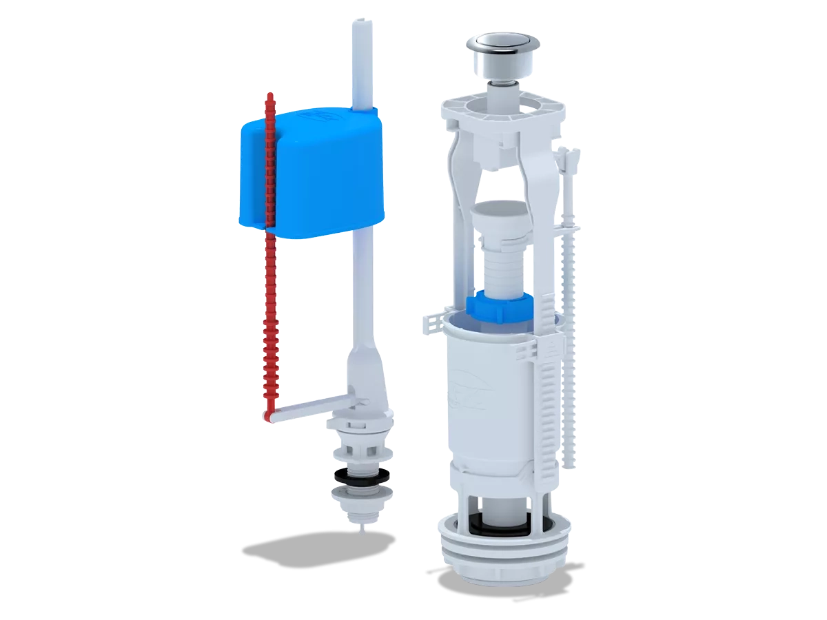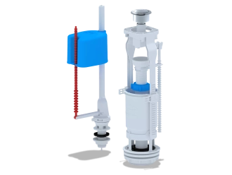 ![CDATA[Набор для бачка унитаза. Наливной механизм с нижней подводкой и пластиковой резьбой диаметром 1/2". Сливной механизм металлизированная кнопка с одним режимом слива эконом]]