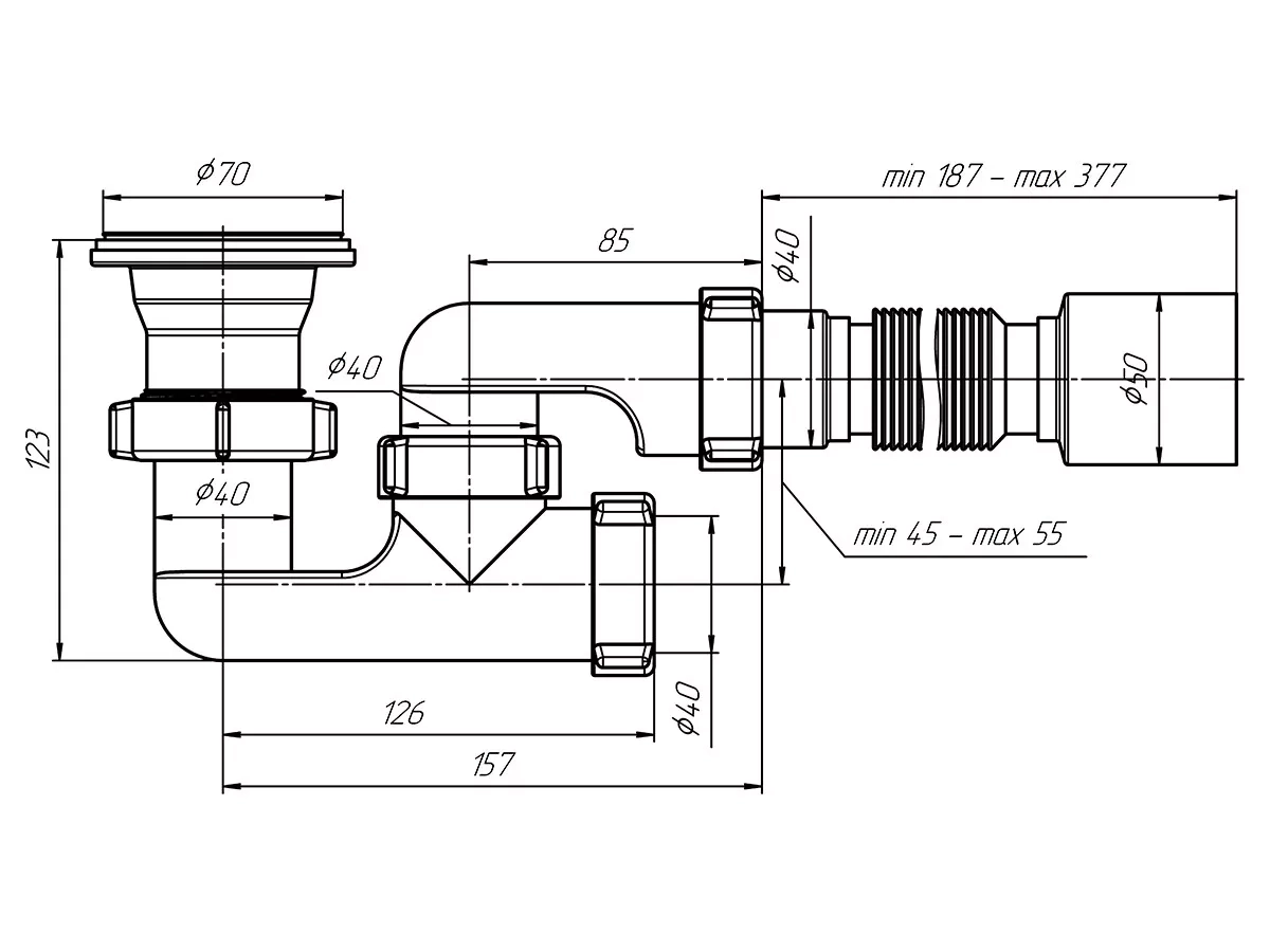 ![CDATA[Сифон АНИ для душевого поддона 1 1/2"*40 с гибкой трубой 40х50 и трубой 45*40*50]]