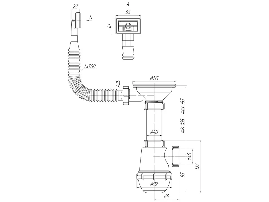 Сифон для кухонної мийки ANI-plast A0145S, 3 1/2" x 40 з гнучким переливом, без випуску