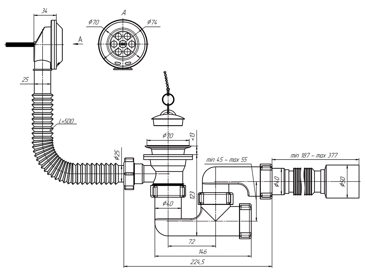 ![CDATA[Сифон АНИ для ванны регулируемый с 45*40*50 и 375*40*50]]