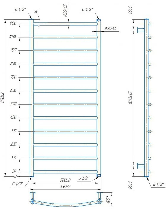Водяна рушникосушка INOX Класік 1170х530/500 полірована